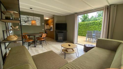 På Gemoderniseerd en modern chalet bij het bos har du som gäst en terrass, utsikt över trädgården, en sittgrupp, en platt-tv, ett fullt utrustat kök med ett kylskåp och en ugn samt ett eget badrum med dusch. En spishäll finns också samt en kaffemaskin och en vattenkokare.