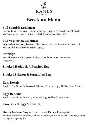 A hearty full Scottish breakfast is served each morning, which guests can enjoy with a view over the sea. Freshly ground coffee is also available, as well as Loch Fyne kippers and porridge. A bar menu including hand-made burgers and battered haddock is also on offer, as well as a specials board with the catch or game of the day.