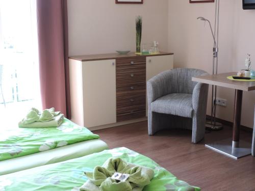 Alla rum på Pension Achteridyll har en sittgrupp, en platt-tv med satellitkanaler och ett eget badrum med hårtork och dusch. Alla rum har eget badrum, värdeskåp och gratis WiFi. En del av rummen har balkong och några har utsikt över havet. På boendet ingår sängkläder och handdukar i samtliga rum.