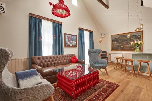 Guests can relax beside the fireplace in the lobby area. Icelandic films can be watched at Slipp Cinema.