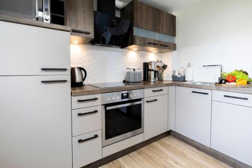 Це помешкання (апартаменти) складається зі спалень (2), вітальнi, повністю обладнаної кухні з холодильником і кавоваркою, а також ванних кімнат (1) з біде та безкоштовними туалетно-косметичними засобами. На території помешкання Design Maisonette - 24h Self-Check-in - bis 7 Pers - Parkplatz - WiFi - Balkon -Terrasse - Radwege розташована приватна парковка.