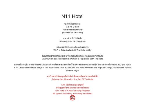 У помешканні N11Hotel гостям пропонують номери з кондиціонером та телевізором із плоским екраном в районі Chatuchak District міста Бангкок. Помешкання розташовано приблизно за 2 км від пам'ятки "Торговий центр Central Plaza Ладпрао", за 5,2 км від пам'ятки "Ринок Чатучак" і за 11 км від пам'ятки "Торговий центр Central Festival EastVille". В околицях помешкання гості можуть відвідати пам'ятку "Торговий центр Siam Paragon" за 11 км, а пам'ятку "Торговий центр Central World Plaza" – за 11 км.