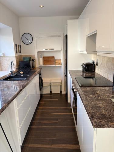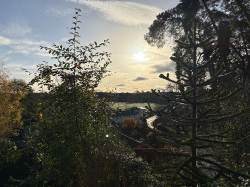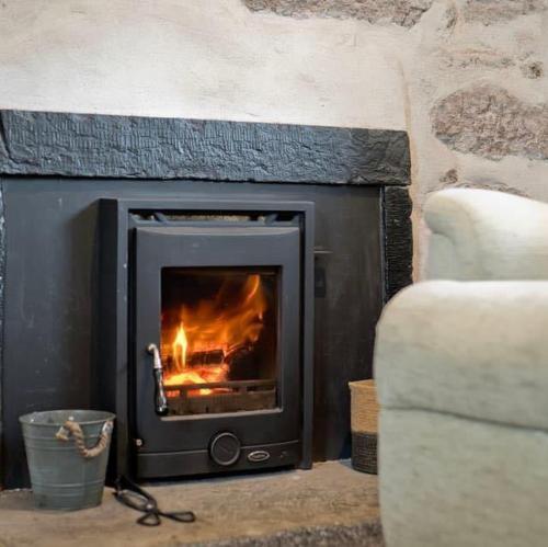 The holiday home with a patio and garden views features 2 bedrooms, a living room, a flat-screen TV, an equipped kitchen with a dishwasher and an oven, and 1 bathroom with a shower. Towels and bed linen are featured in the holiday home. There is also a seating area and a fireplace.