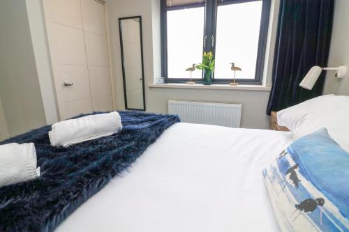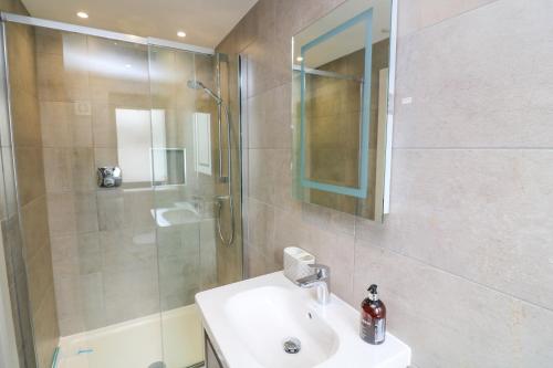 The spacious apartment has 2 bedrooms, a TV, a fully equipped kitchen with a dishwasher and an oven, a washing machine, and 2 bathrooms with a walk-in shower.