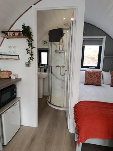 这家小木屋配有1间独立卧室、1间带吹风机的浴室和休息区。这家小木屋配备海景露台,也拥有平板电视、1间带淋浴设施和免费洗浴用品的浴室以及带冰箱、微波炉和吐司机的设施齐全的小厨房。