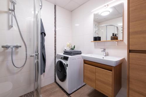 这家空调公寓配有1间卧室、起居室、带冰箱和咖啡机的设施齐全的厨房以及1间带淋浴设施和免费洗浴用品的浴室。这家公寓还配备休息区、洗衣机以及1间带吹风机的浴室。