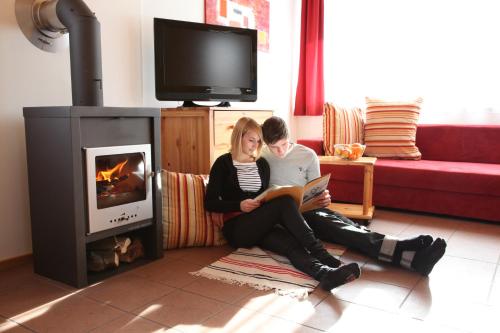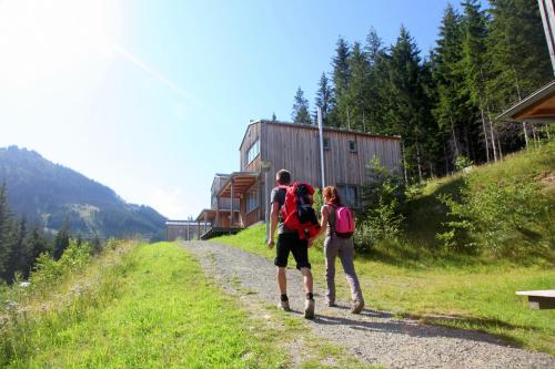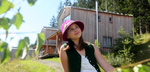 Hüttendorf Präbichl酒店的宽敞小木屋有2层,一层拥有大客厅、起居和用餐区、小厨房、桑拿浴室、壁炉以及可观赏周围阿尔卑斯山景致的露台;楼上拥有2间卧室和1间浴室。酒店还可应要求提供面包和食品配送服务。