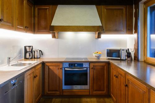 这家小木屋享有山景,提供露台,配有6间卧室、起居室、卫星频道平板电视、设施齐全的厨房以及3间带淋浴设施和浴缸的浴室。3间浴室提供吹风机。