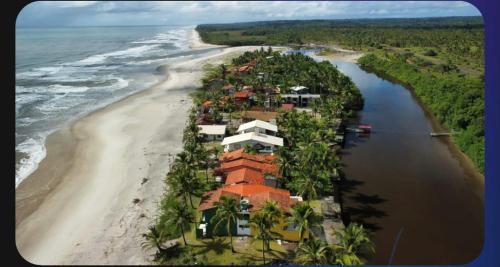 Chalé charme na Ilha do desejo ilhéus享有海景,配备花园、私家海滩和露台,距离阿瓜斯德奥利文卡海滩(Aguas de Olivenca Beach)约有几步路。这家住宿距离伊列乌斯巴士站有30公里,提供酒吧和免费私人停车位。