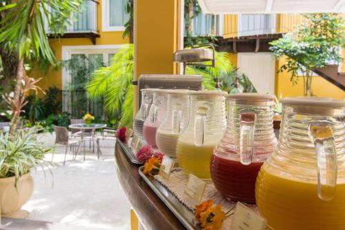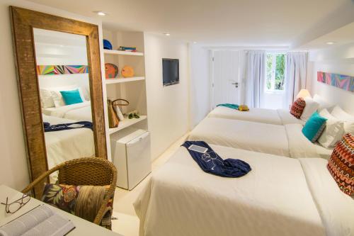 La Chimère Búzios Essence旅馆的客房拥有质朴的氛围和缤纷的装饰,配有空调、带有线频道的液晶电视、迷你吧、保险箱和电话。私人浴室配有淋浴。