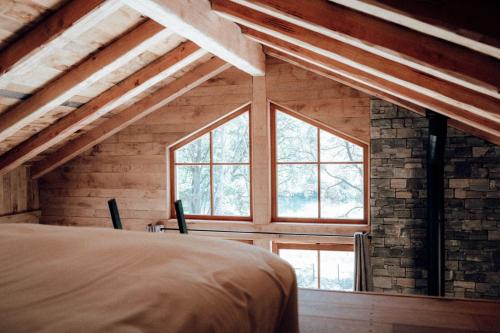 这家小木屋享有山景,铺有镶木地板,配有1间卧室以及1间带淋浴设施、热水浴池和免费洗浴用品的浴室。这家小木屋提供河景露台,也为客人提供1间浴室以及带冰箱、微波炉和迷你吧的设施齐全的厨房。