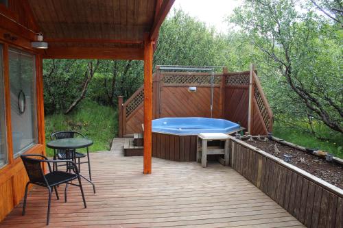 Relaxing and cozy cottage with hot tub坐落于胡萨费尔,提供露台。这家住宿距离巴纳瀑布有19公里,配备花园和免费私人停车位。