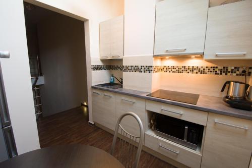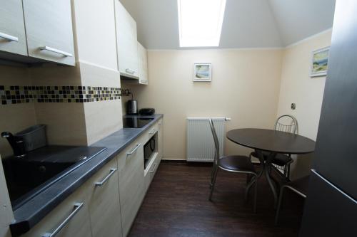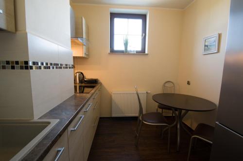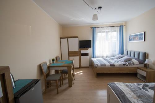 房间铺有镶木地板,配有带冰箱的设施齐全的小厨房、用餐区、带有线频道的平板电视以及带淋浴设施和吹风机的私人浴室。