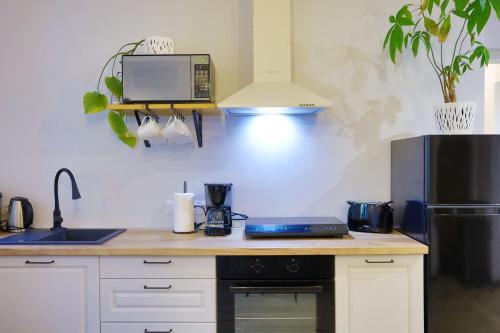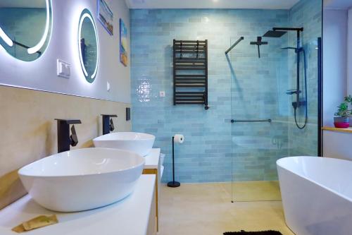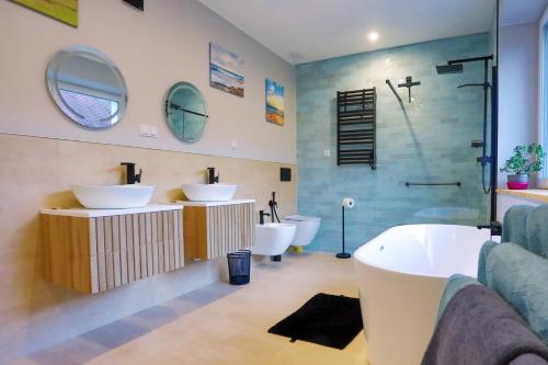 这家公寓配有2间卧室、起居室、带冰箱和咖啡机的设施齐全的小厨房以及1间带坐浴盆和淋浴设施的浴室。这家公寓还配备平板电视以及1间带热水浴池和浴缸的浴室。