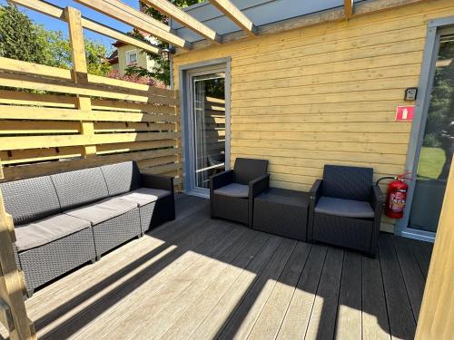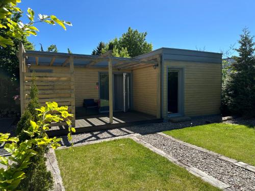 这家度假屋享有花园景,配备露台,配有2间卧室、起居室、平板电视、设施齐全的小厨房以及1间带淋浴设施的浴室。这家度假屋也配有休息区和1间浴室。