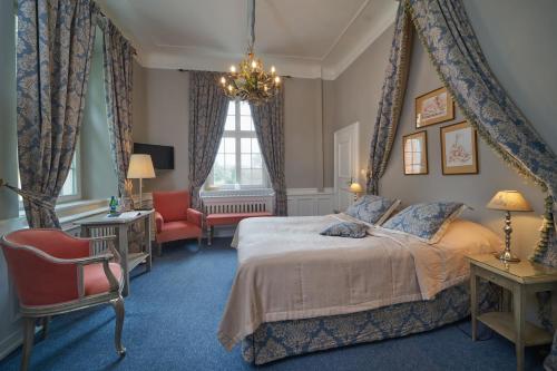 The restaurant serves delicious local cuisine, which guests can enjoy by the fireplace or on the sunny terrace in the summer. The Blue Hall and the Pink Salon, with views of the river and the park, are available for groups.