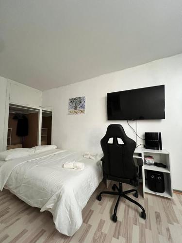 The apartment is composed of 1 separate bedroom, a fully equipped kitchen, and 1 bathroom. A flat-screen TV is available.