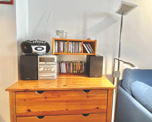这家公寓配有1间卧室、起居室、带冰箱和咖啡机的设施齐全的小厨房以及1间带浴缸或淋浴设施和吹风机的浴室。这家公寓也提供1间浴室。