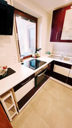 这家公寓提供露台,享有花园景,配有1间卧室、起居室、平板电视、带冰箱和洗碗机的设施齐全的厨房以及1间带淋浴设施的浴室。1间浴室提供吹风机。