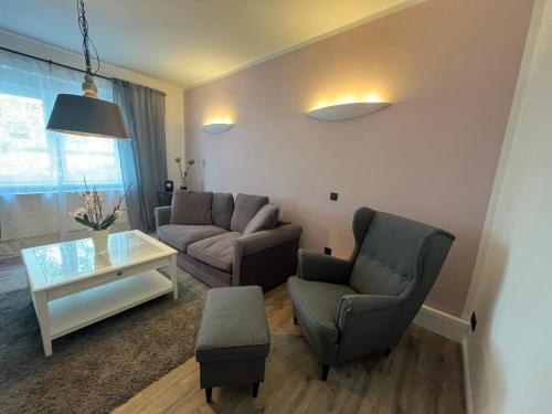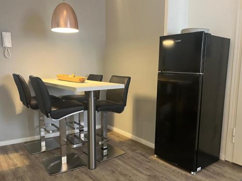 这家公寓配有1间卧室、起居室、带冰箱和咖啡机的设施齐全的厨房以及1间带淋浴设施和吹风机的浴室。这家公寓也提供休息区和1间浴室。