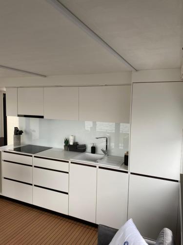 这家空调船屋配有2间卧室、起居室、带冰箱和咖啡机的设施齐全的厨房以及1间带淋浴设施和吹风机的浴室。这家船屋也配有休息区和1间浴室。