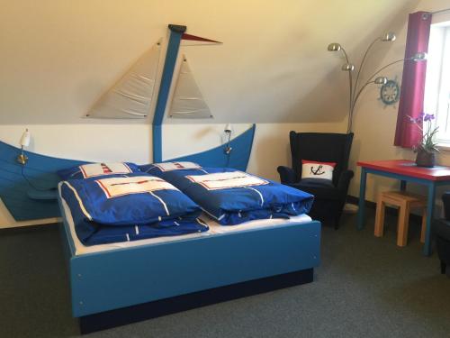 Pension Sössaarep's Hüs酒店的明亮客房拥有海洋色彩的装饰。每间客房都设有一台平面电视和一间时尚的浴室,并可欣赏到花园的迷人景色。