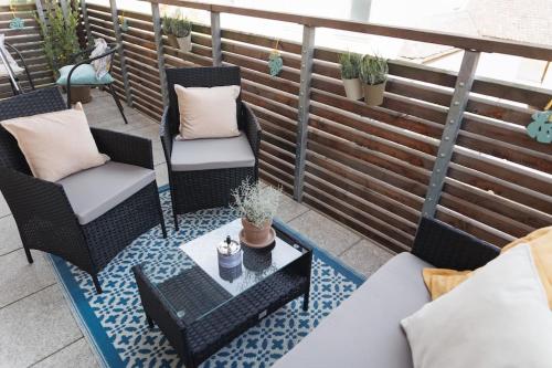这家2卧室公寓配有起居室、平板电视、带冰箱和洗碗机的设施齐全的厨房以及1间带吹风机的浴室。这家公寓也拥有1间浴室。