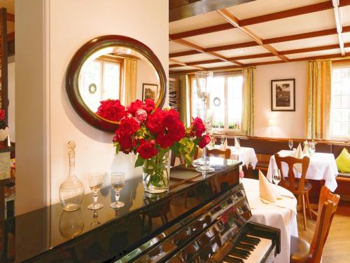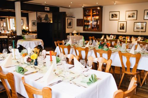 Hotel Linde Durbach酒店的餐厅拥有乡村风格的装饰,提供巴登地区的美食和当地生产的葡萄酒。夏季,露台上供应饮品和餐点。
