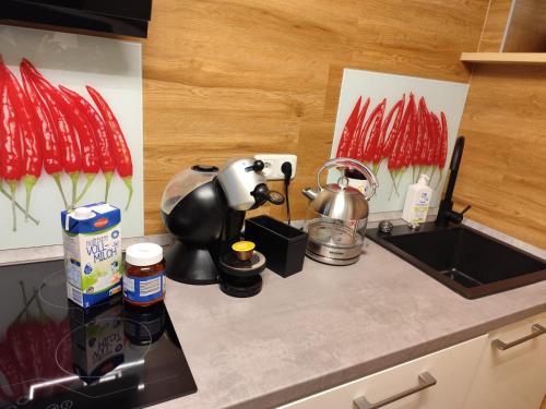 这家公寓配有1间卧室、起居室、带冰箱和咖啡机的设施齐全的厨房以及1间带淋浴设施和吹风机的浴室。这家公寓也提供休息区和1间浴室。