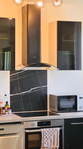 这家空调度假屋配有2间卧室、起居室、带冰箱和咖啡机的设施齐全的厨房以及1间带浴缸或淋浴设施和免费洗浴用品的浴室。这家度假屋还配备休息区、洗衣机以及1间带吹风机的浴室。