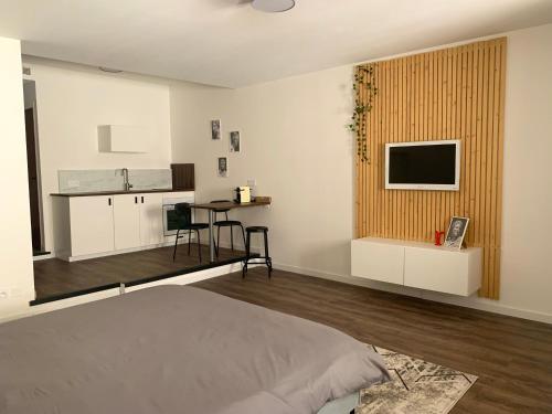 Studio Via Romana Vaison La Romaine拥有平板电视、带冰箱和烤箱的设施齐全的厨房以及带淋浴设施和免费洗浴用品的浴室。这家公寓配备毛巾和床上用品。