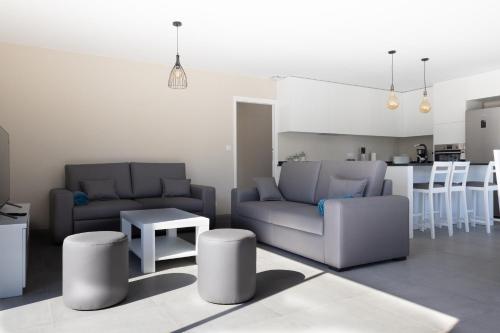 这家空调别墅配有3间卧室、起居室、带冰箱和咖啡机的设施齐全的厨房以及2间带淋浴设施和吹风机的浴室。这家别墅还配备平板电视、休息区、洗衣机以及2间带浴缸的浴室。