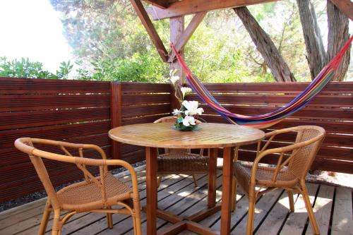 The chalet’s kitchenette features hotplates and a microwave for making meals. Guests can then choose to dine in the dining area or on the furnished patio.