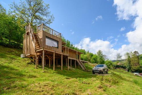 这家空调小木屋配有1间卧室、起居室、带冰箱和咖啡机的设施齐全的厨房以及1间带淋浴设施和免费洗浴用品的浴室。这家小木屋还配备电视以及1间带浴袍的浴室。
