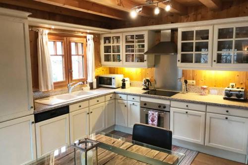 这家小木屋提供3间卧室、3间浴室、床上用品、毛巾、带卫星频道的平板电视、用餐区、设施齐全的厨房以及山景露台。这家小木屋也配有3间带淋浴设施、浴缸和吹风机的浴室。