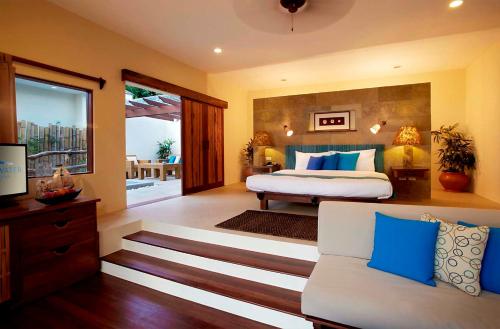 Bluewater Island Resort Sumilon度假村的宽敞小屋配有带休闲椅的私人凉廊、空调、电视、办公桌、保险箱和带热/冷水淋浴的私人浴室。