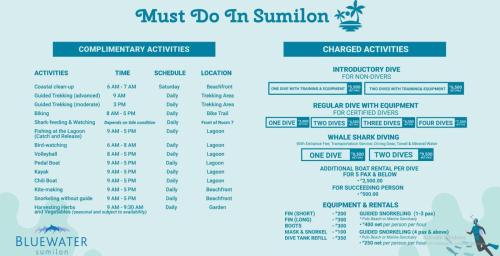 客人可以享受按摩服务或进行钓鱼、浮潜和潜水等活动,还可在度假村的纪念品店购买礼品。Sumilon Bluewater度假村亦可安排洞穴之旅及观光行程,设有免费私人停车场。