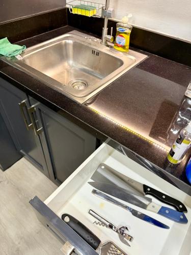 空调房间提供设施齐全的小厨房,内设用餐区、冰箱、电热水壶和微波炉。