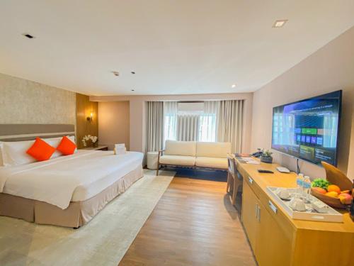 Hotel St. Ellis酒店的客房享有城市、游泳池或Mt. Mayon山的景色。每间客房均设有保险箱、沏茶/咖啡机设施以及带冷热水淋浴的连接浴室。