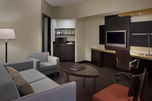 Hilton Suites Toronto-Markham Conference Centre & Spa酒店的每间宽敞套房均配有独立的起居室和卧室,提供2台32英寸平板电视和MP3基座。