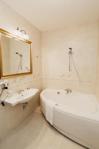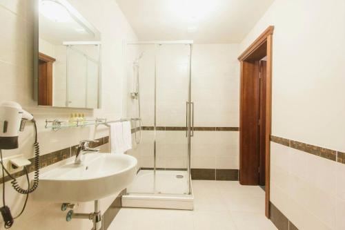 部分房间提供带坐浴盆、免费洗浴用品、吹风机和拖鞋的私人浴室。