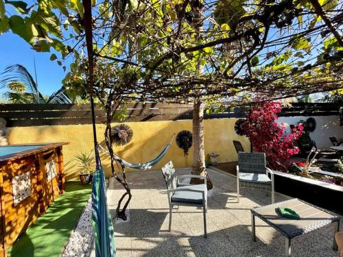 这家度假屋配备3间卧室、1间浴室、床上用品、毛巾、平板电视、设施齐全的厨房以及花园景露台。这家度假屋提供空调,也提供1间带热水浴池和洗衣机的浴室。