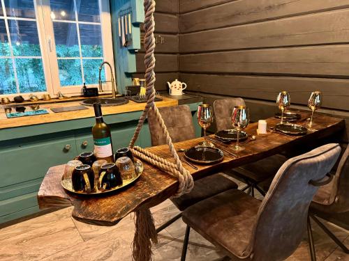 这家空调小木屋配有2间卧室、起居室、带冰箱和电热水壶的设施齐全的厨房以及1间带淋浴设施和热水浴池的浴室。1间浴室配有浴缸,也提供免费洗浴用品,提供毛巾和床上用品。