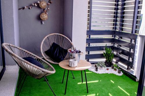 这家公寓提供2间卧室、1间浴室、床上用品、毛巾、带有线频道的平板电视、用餐区、设施齐全的厨房以及市景露台。这家空调公寓还配备休息区、洗衣机以及1间带淋浴设施的浴室。