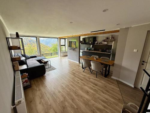 这家度假屋提供露台,享有山景,拥有3间卧室、起居室、平板电视、带冰箱和烤箱的设施齐全的厨房以及2间带淋浴设施的浴室。2间浴室配有浴缸,也配有吹风机,提供毛巾和床上用品。