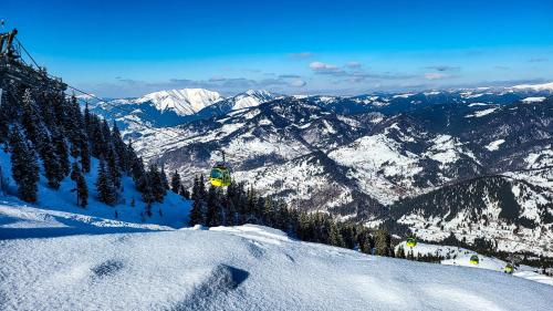 这家山林小屋提供露台,享有山景,配有2间卧室、起居室、平板电视、带冰箱和微波炉的设施齐全的小厨房以及1间带浴缸或淋浴设施的浴室。1间浴室提供免费洗浴用品。