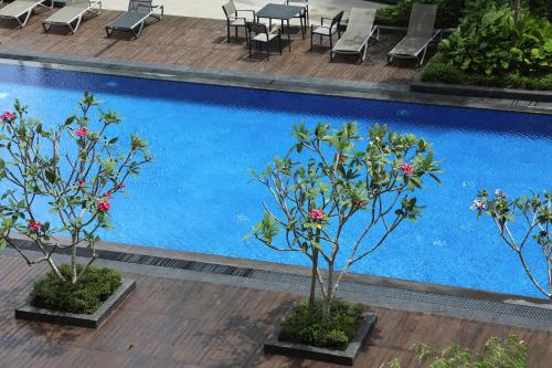 这家公寓提供露台,享有池景,拥有1间卧室、起居室、平板电视、带冰箱和微波炉的设施齐全的厨房以及1间带坐浴盆的浴室。1间浴室配有淋浴设施,也配有吹风机,提供毛巾和床上用品。