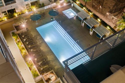 DTLA Escape Skyline views with luxury amenities位于洛杉矶,提供享有市景和山景的露台、全年开放的室外泳池、健身中心以及热水浴池。住宿提供内部餐厅、免费私人停车位和免费WiFi。