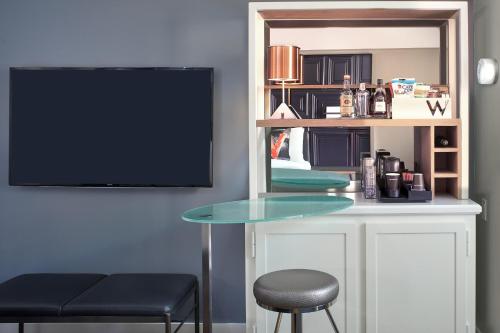 W Boston酒店于每间客房设有1台Bose音响播放机和DVD播放机,还配备了一张办公桌和小吃。