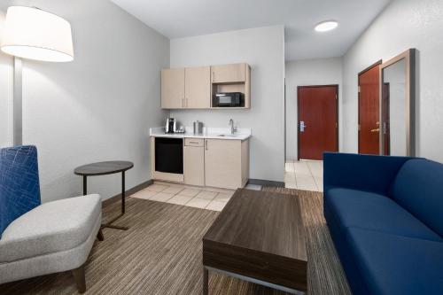 Holiday Inn Express Hotel & Suites Acme-Traverse City酒店的现代化客房设有咖啡设施和休息区。宽敞的客房提供白色和蓝色的寝具和大型窗户。